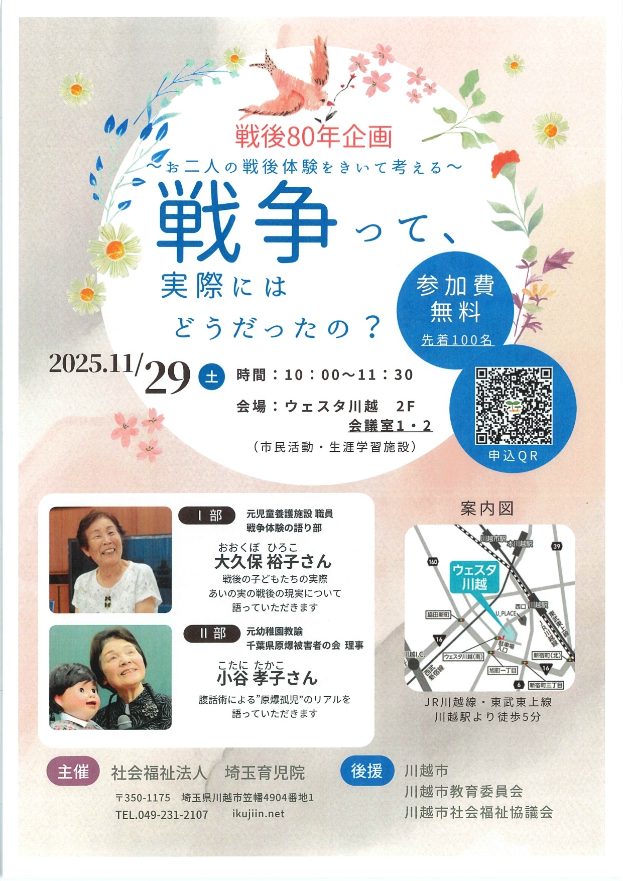 一覧へ戻る 戦後80年企画~お二人の戦後体験をきいて考える~2025-10-31 戦後80年企画~お二人の戦後体験をきいて考える~戦争って実際にはどうだったの?日時:2025/11/29(土) 10:00~11:30場所:ウェスタ川越 2F 会議室1・2(市民活動・生涯学習施設)※参加費無料 先着100名、QRコードより申し込みください。戦後80年、忘れてはいけない記憶があります。戦争を知らない世代が増えていく中、まずは戦争を知り、平和の大切さを改めて考える機会になればと思っています。